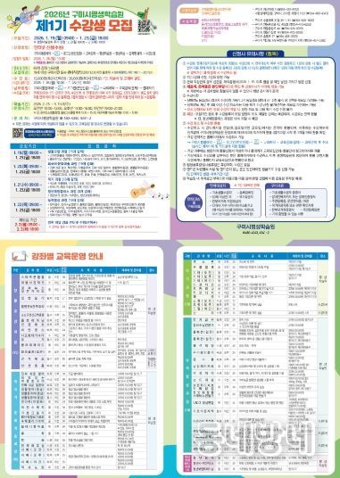 동네방네 김형규 기자 | 구미시는 1월 19일부터 23일까지 구미시 통합예약 포털을 통해 2026년 제1기 정기과정 수강생 1,650명을 모집한다. 이번 정기과정은 2월 23일부터 5월 15일까지 5개 과정 69개 강좌가 12주 동안 운영된다.