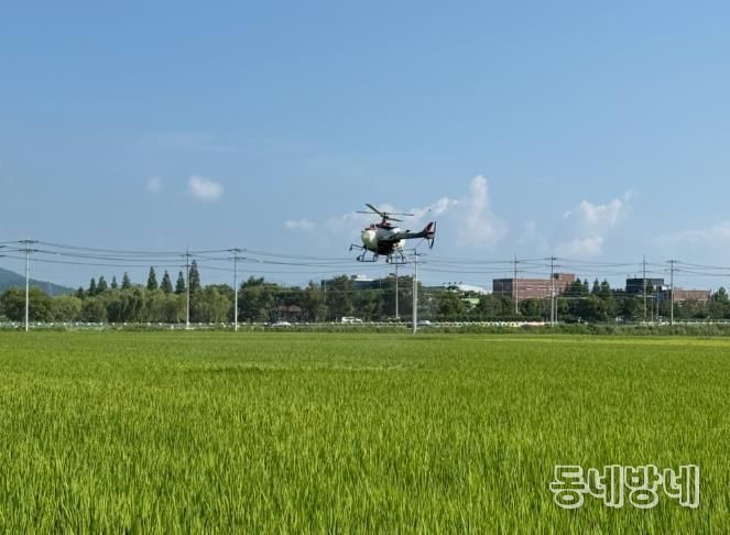 벼 병해충 공동방제 농작업 대행료 지원사업은 마을·들녘 단위 10ha내외의 구획화된 벼 재배단지를 대상으로 농약살포 무인헬기, 드론, 광역방제기, 붐스프레이어 등을 활용한 방제작업 대행료를 연 최대 3회까지 전액 지원한다.
