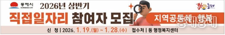 동네방네 김형규 기자 | 동해시는 취업 취약계층의 생계 안정을 돕고 지역경제에 활력을 불어넣기 위해 오는 19일부터 2026년 상반기 직접일자리사업 참여자 모집을 시작한다.