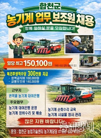 동네방네 김형규 기자 | 합천군은 농기계대여은행 운영체계를 강화하고 농업인 영농 편의를 높이기 위해 2026년 농기계 업무보조원 기간제근로자 9명을 채용한다고 14일 밝혔다.