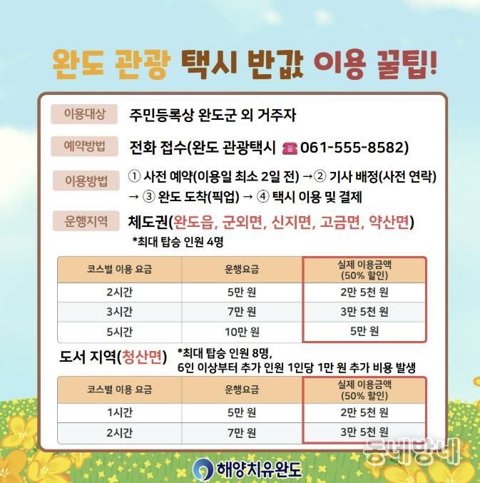 군 관계자는 “반값 관광 택시를 통해 이동의 불편함을 줄이고, 매력 있는 완도 관광지를 두루두루 둘러보시길 바란다”라고 말했다.