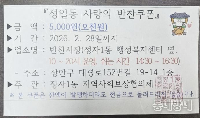 동네방네 김형규 기자 | 수원시 장안구 정자1동 지역사회보장협의체는 금년부터 관내 취약계층 가구를 대상으로 매월 5가구에 2만원 상당의 반찬쿠폰을 지급하는 사업을 시작한다고 지난 13일 밝혔다.