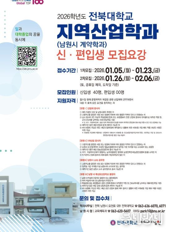 동네방네 김형규 기자 | 남원시(시장 최경식)와 전북대학교는 지역 특화산업 전문인력 양성을 위해 2026학년도 전북대학교 지역산업학과(남원시 계약학과) 신·편입생을 모집한다고 밝혔다.