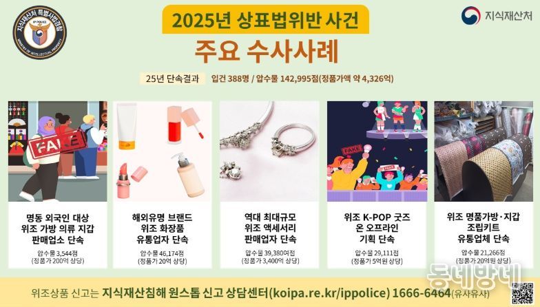 동네방네 김형규 기자 | 지식재산처는 지난해 상표권 침해와 위조상품 유통에 대한 전방위적인 단속을 통해, 상표권 침해사범 388명을 형사입건하고, 위조상품 약 143천여 점(정품가액 4,326억원 상당)을 압수했다고 밝혔다.