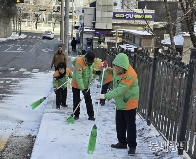이날 방재단원 약 10명이 참여해 제설용 송풍기 1대와 넉가래 등 장비를 활용, 이면도로와 보행로, 인도 등 결빙 우려 구간을 중심으로 눈 쓸기와 얼음 제거, 염화칼슘 살포 작업을 진행했다.