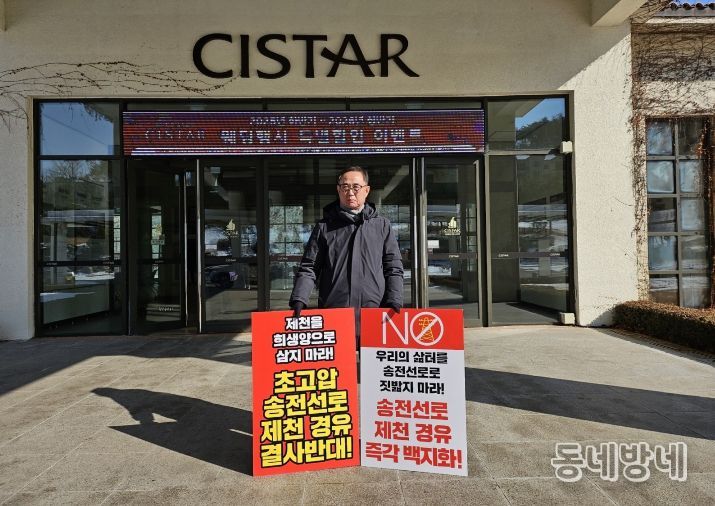 동네방네 김형규 기자 | 제천 신평창-신원주 송전선로 건설사업 반대추진위원회 신창준 위원장은 지난 14일 영월 동강시스타에서 열린 제5차 입지선정위원회 회의장 앞에서 1인 시위를 벌이고, 송전선로 건설계획 중단과 입지 선정 절차의 전면 재검토를 강력히 촉구했다.