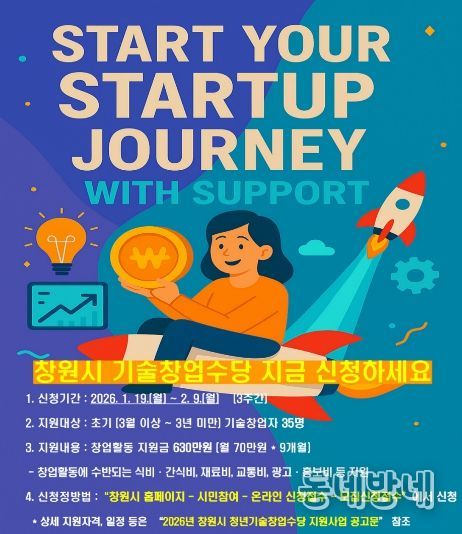 동네방네 김형규 기자 | 창원특례시는 1월 19일부터 2월 9일까지 ‘2026년 청년기술창업수당 지원사업’ 참여자 35명을 모집한다고 밝혔다.