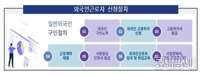 고용허가를 받으려면 사업주는 신청 전 7일간 워크넷을 통해 내국인 구인 노력을 거쳐야 하며, 최근 2개월 내 내국인 근로자를 이직시킨 사실이 없어야 한다. 또한 임금체불 이력이 없고 고용보험 및 산재보험에 가입돼 있어야 한다.