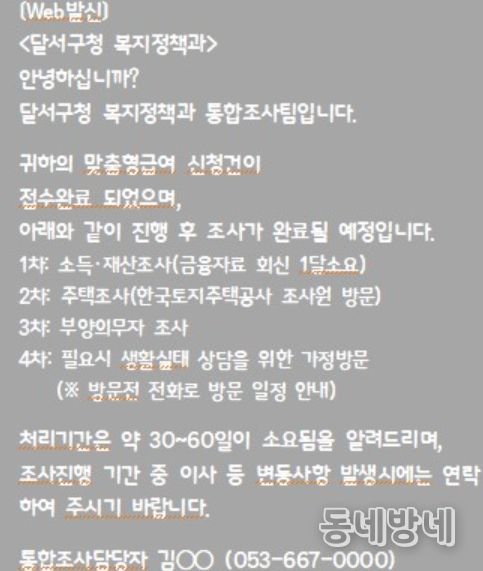 동네방네 김형규 기자 | 대구 달서구는 맞춤형 복지급여(생계·의료·주거·교육) 신청인을 대상으로 조사 진행 상황을 안내하는 ‘알림톡 서비스’를 2026년에도 확대 시행한다.