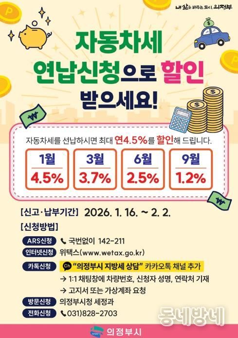 동네방네 김형규 기자 | 의정부시는 자동차세를 1월에 연납으로 납부하면 연간 세액의 최대 4.5%를 공제받을 수 있다고 밝혔다.