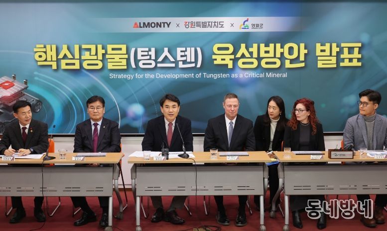 동네방네 김형규 기자 | 김진태 강원특별자치도지사는 1월 15일, ㈜알몬티 인더스트리 최고운영책임자(COO)인 스티븐 알렌(Steven Allen), 최명서 영월군수 등과 함께 영월 상동 텅스텐 광산을 중심으로 한 핵심광물(텅스텐) 육성 방안을 발표했다.
