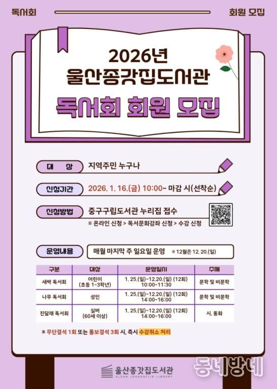 동네방네 김형규 기자 | 울산 중구에서 운영하는 울산종갓집도서관이 2026년 독서회 회원을 모집한다.