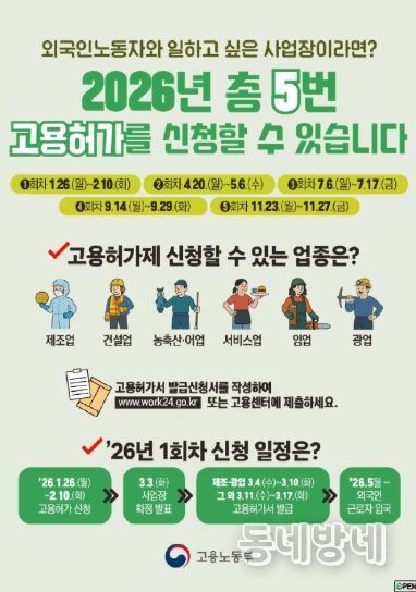 동네방네 김형규 기자 | 고용노동부는 구인난을 겪는 기업이 이주노동자(E-9)를 고용할 수 있도록 ‘26년도에도 5차례 신규 고용허가 신청․접수를 진행할 예정이라고 밝혔다.