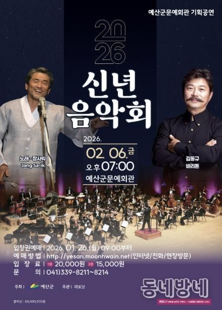 동네방네 김형규 기자 | 예산군은 군민과 함께 희망찬 2026년 새해를 여는 ‘2026년 신년 음악회’를 오는 2월 6일 오후 7시 예산군문예회관 공연장에서 개최한다고 밝혔다.