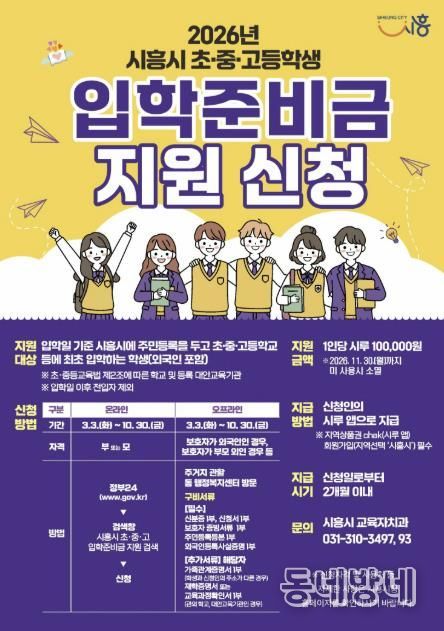 동네방네 김형규 기자 | 시흥시는 올해부터 관내 초중고 입학 자녀 가정에 입학준비금을 10만 원씩 지원한다. 이번 지원은 도서나 문구류 등을 새로 마련해야 하는 신입생 가정의 경제적 부담을 줄여주고, 교육 기본권을 강화하고자 추진됐다.