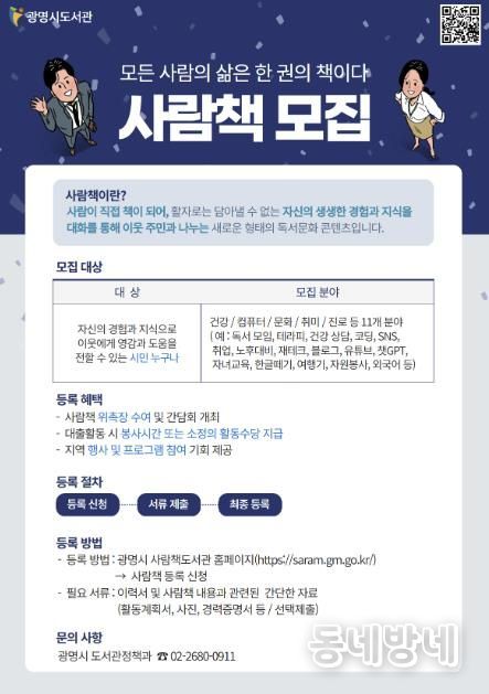 시는 책으로는 접하기 어려운 개인의 경험과 지혜를 이웃과 공유하는 ‘광명시 사람책’을 오는 2월 28일까지 모집한다고 16일 밝혔다. 올해는 시민이 직접 주변의 숨은 전문가를 추천하는 ‘사람책 이웃추천제’를 새롭게 도입한다.