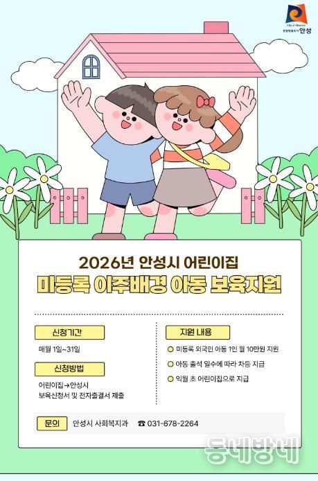 동네방네 김형규 기자 | 안성시는 2026년부터 어린이집에 다니는 미등록 외국인(이주배경) 영유아에게 월 10만원의 보육지원금을 지원한다고 밝혔다.