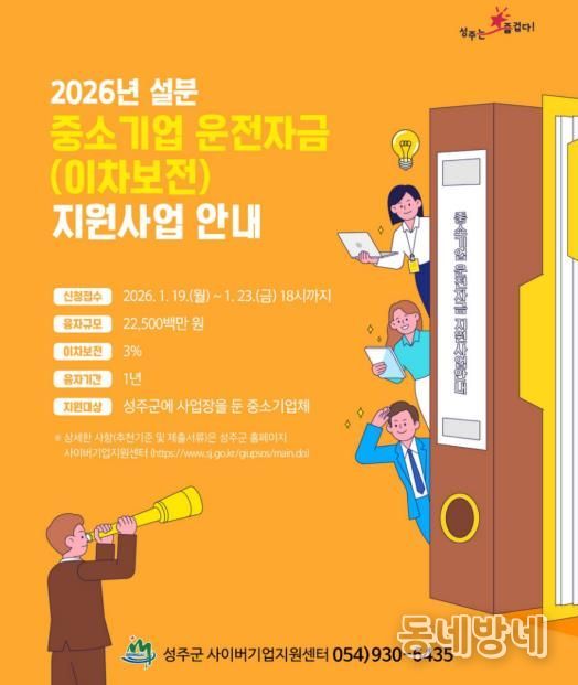 동네방네 김형규 기자 | 성주군은 설 명절을 앞두고 관내 중소기업의 자금 부담 완화를 위해 2026년도 중소기업 운전자금(이차보전) 설 명절분을 225억원 규모로 지원한다.