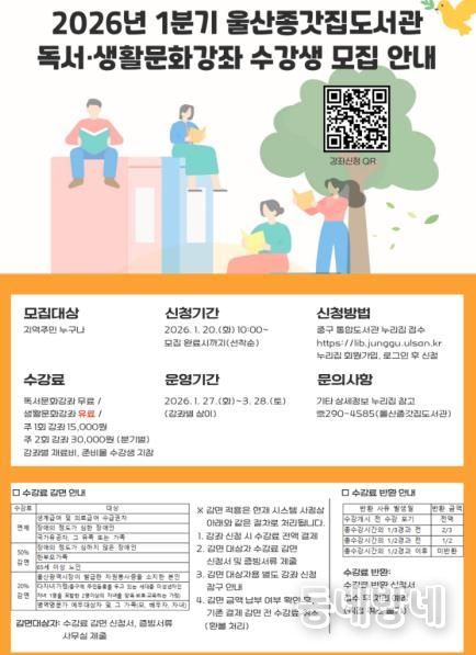 동네방네 김형규 기자 | 울산 중구에서 운영하는 울산종갓집도서관이 2026년 1분기 독서·생활문화강좌 수강생을 모집한다