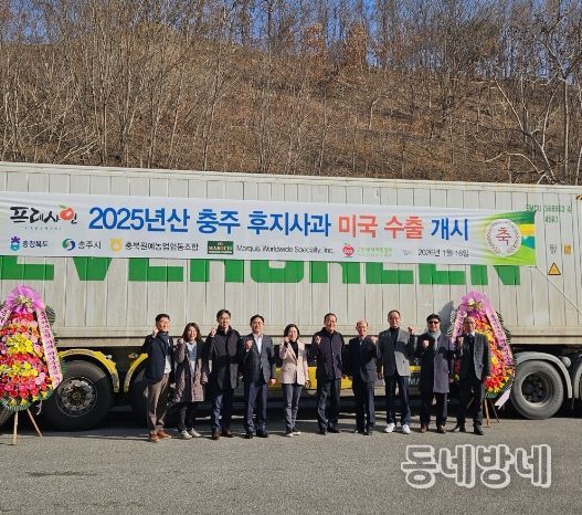 동네방네 김형규 기자 | 충주시는 충북원예농협 충주거점산지유통센터를 통해 충주사과를 미국으로 수출하는 선적식을 16일 개최했다.