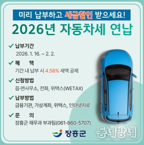 동네방네 김형규 기자 | 장흥군은 15일 2026년도 자동차세 연납 고지서를 장흥군에 등록된 모든 차량 소유자에게 일괄 발송했다고 밝혔다.