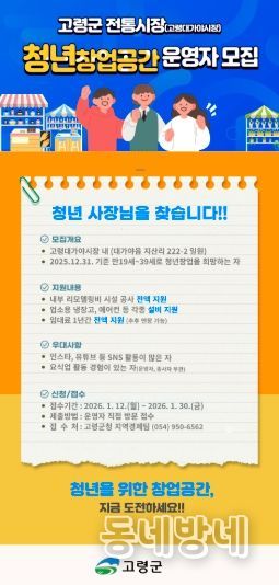 동네방네 김형규 기자 | 고령군은 이달 말 30일까지 고령대가야시장 내 청년창업공간에 신규 점포를 운영할 만19~39세 청년 창업가를 모집한다고 밝혔다.