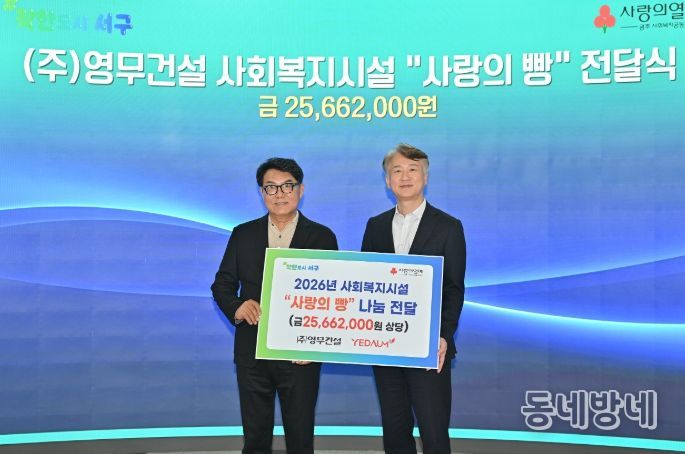 김이강 서구청장은 “정기적인 후원을 통해 따뜻한 나눔을 실천해 주신 ㈜영무건설에 깊이 감사드린다”며 “민관이 함께하는 이러한 나눔이 지역 복지안전망을 더욱 촘촘하고 단단하게 만드는 큰 힘이 될 것이다”고 전했다.