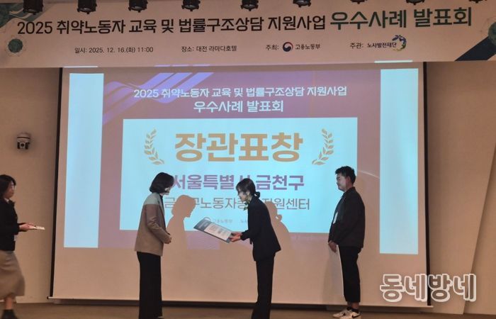 유성훈 금천구청장은 “이번 수상은 노동약자를 위한 금천구의 노력이 인정받은 의미 있는 성과”라며 “어려움에 처한 노동자들이 지역에서 쉽게 도움을 받을 수 있도록 상담과 지원체계를 더욱 강화하겠다”라고 밝혔다.