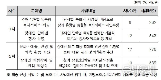 지원사업 1차 공모는 오는 23일(금) 18시까지로 ▴장애 유형별 맞춤형 복지서비스 제공 ▴장애인 단체별 행사 운영 분야를 대상으로 진행되며 결과는 2월 중 발표할 예정이다. 2차 공모 접수는 2월 10일부터 2월 20일 18시까지이며 ▴문화·예술·관광·체육활동 ▴장애인 역량 강화 및 취업 활성화 분야이다.