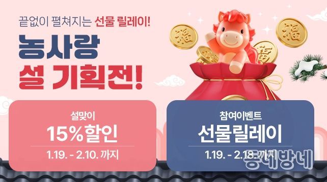 동네방네 김형규 기자 | 충남도 대표 농특산물 온라인 쇼핑몰 충남농사랑이 한 해의 시작을 알리는 설 명절을 맞아 도내 농특산물의 소비 촉진, 지역 농가의 소득 증대와 함께 도민의 합리적이고 건강한 소비를 위해 19일부터 2월 10일까지 설 명절 기획전을 진행한다.