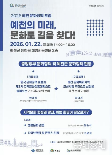 예천 문화특화지역 조성사업 '영차영차 예천문화'의 일환으로 추진하는 이번 포럼은 22일 ‘문화정책 포럼’을 시작으로 ‘협력 거버넌스 포럼’이 세 차례에 걸쳐 이어진다.