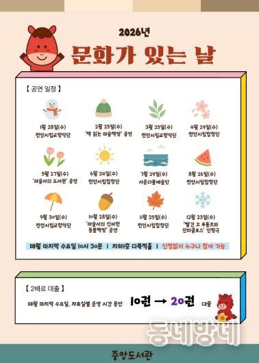 동네방네 김형규 기자 | 천안시 중앙도서관은 매달 마지막주 수요일 ‘2026 문화가 있는 날’을 운영한다고 19일 밝혔다.