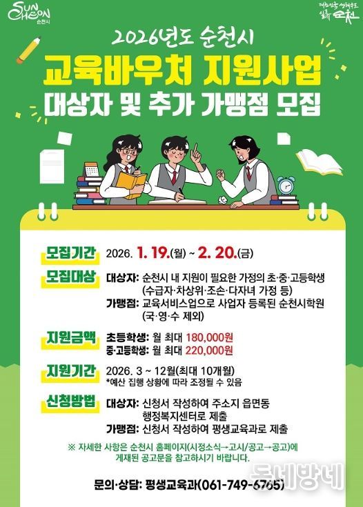 동네방네 김형규 기자 | 순천시가 가정형편 등으로 학원 수강이 어려운 취약계층 가정 학생들에게 수강료를 지원하는 교육바우처 사업을 시행한다.