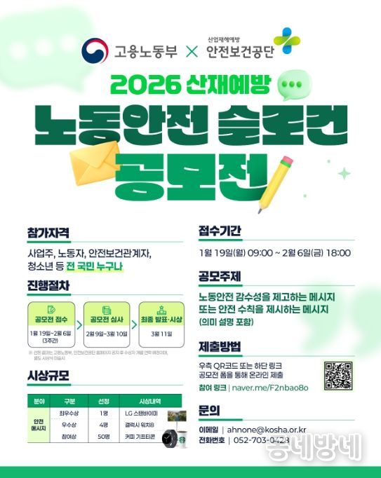 동네방네 김형규 기자 | 고용노동부와 한국산업안전보건공단은 1월 19일부터 우리 국민 누구나 참여할 수 있는 산재예방 노동안전 슬로건 공모를 실시한다.