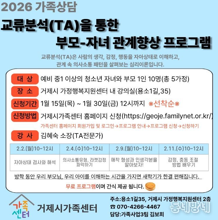 동네방네 김형규 기자 | 거제시가족센터는 오는 2일부터 진행하는'교류분석(TA)을 통한 부모–자녀 집단상담 프로그램' 참여자를 모집한다고 밝혔다.