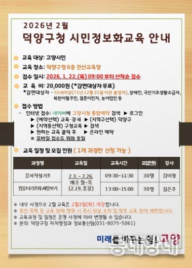 동네방네 김형규 기자 | 고양특례시 덕양구는 고양시민의 디지털 역량 강화를 위해 ‘2026년 제1차 덕양구 시민정보화교육’ 수강생을 오는 22일부터 모집한다고 밝혔다.