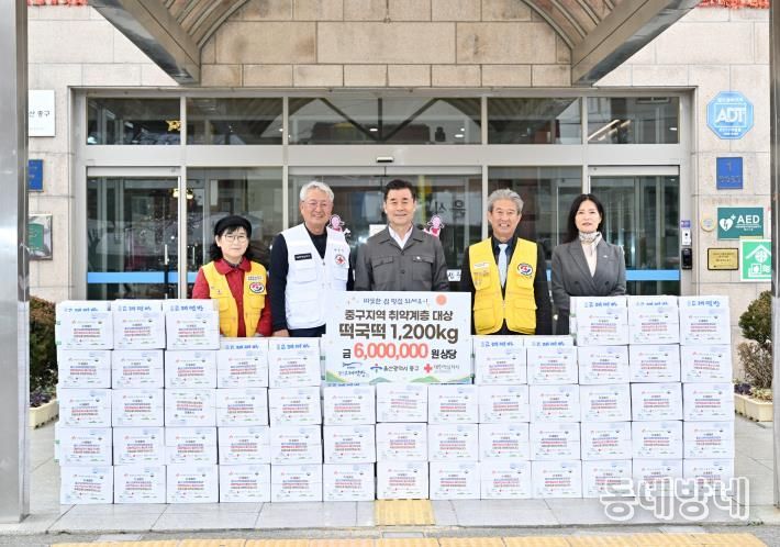 이번 전달식에는 김영길 중구청장과 신용일 울산고래떡방협동조합 대표, 채종성 대한적십자사 울산광역시지사회장 등 5명이 참석했다.