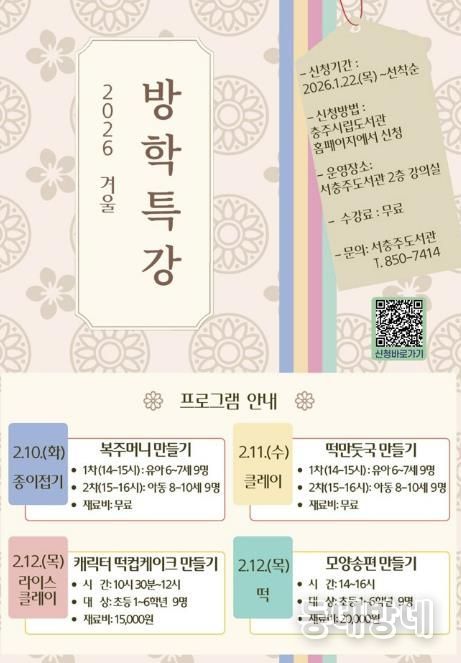 동네방네 김형규 기자 | 서충주도서관은 설날을 맞아 관내 유아와 어린이들을 대상으로 ‘겨울방학 특강’을 운영한다고 20일 밝혔다.