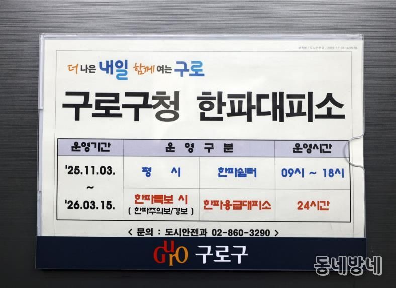 동네방네 김형규 기자 | 구로구는 1월 20일부터 시작되는 강력 한파 예보에 따라 한파쉼터 및 응급대피소 운영 현황을 안내하고, 주민들의 적극적인 이용을 당부하고 나섰다.