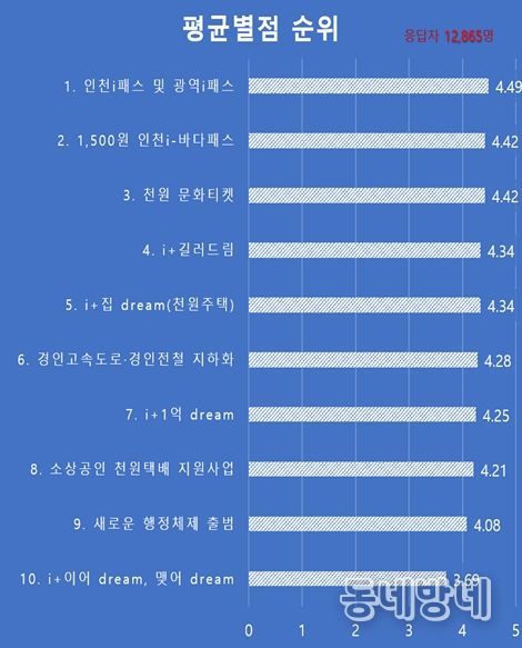 설문은 인천시가 추진 중인 10대 주요 사업에 대해 5점 만점의 별점 평가 방식으로 진행됐으며, 전반적으로 높은 점수를 받았다.