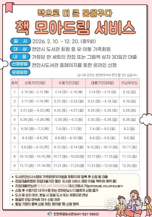 동네방네 김형규 기자 | 천안시 두정도서관은 내달부터 전집을 대여해주는 ‘책 모아드림 서비스’를 본격 운영한다고 20일 밝혔다.