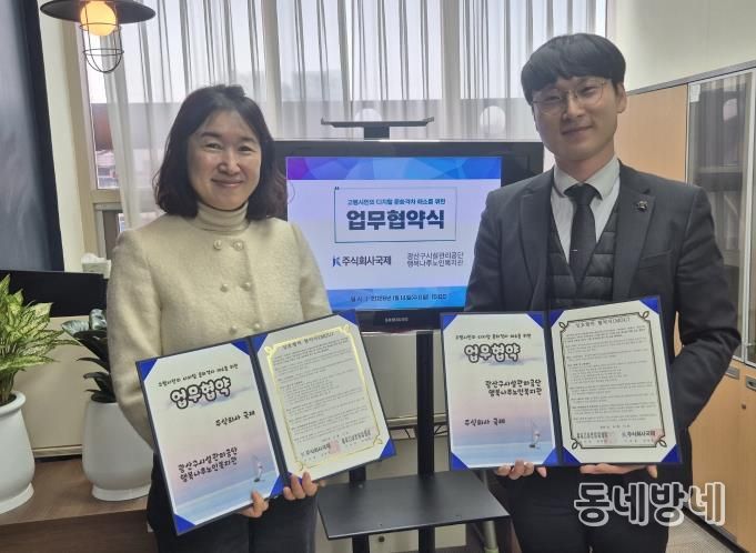 동네방네 김형규 기자 | 광주광역시광산구시설관리공단 행복나루노인복지관은 1월 14일 주식회사 국제(대표 김정수)와 고령시민의 디지털 문화격차 해소 및 정보화 역량 강화를 위한 업무협약을 체결했다.