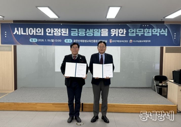 동네방네 김형규 기자 | (재)광주인재평생교육진흥원(원장 송형길)은 (사)시니어금융교육협의회(사무총장 오영환)와 19일 시니어의 안정된 금융생활과 금융소비자 보호를 위한 업무협약을 체결했다.