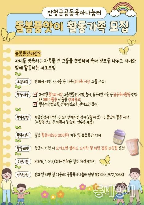 동네방네 김형규 기자 | 산청군가족센터는 20일 공동육아나눔터 운영 일환으로 돌봄품앗이 활동 가족을 모집한다고 밝혔다.