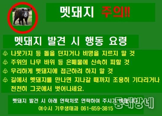 동네방네 김형규 기자 | 여수시는 최근 산행·산책로에서 멧돼지를 마주치는 등의 사례가 빈번하게 발생함에 따라 안전사고 예방을 위한 각별한 주의를 요구하고 있다.