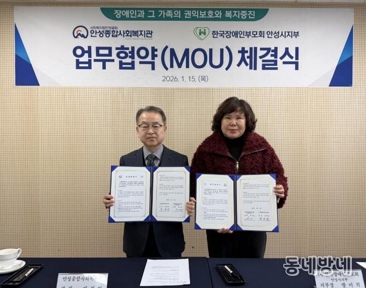 동네방네 김형규 기자 | 안성종합사회복지관은 지난 15일 (사)한국장애인부모회 안성시지부와 장애인·가족 권익 보호 및 복지 증진을 위한 업무협약(MOU)을 체결했다.