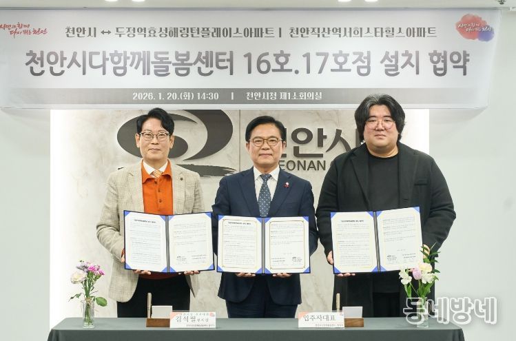 동네방네 김형규 기자 | 천안시는 20일 시청 소회의실에서 두정역 효성해링턴플레이스·직산역 서희스타힐스 아파트 입주자대표회의와 ‘다함께돌봄센터 16·17호점 설치를 위한 업무협약’을 체결했다.