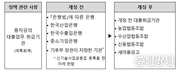 이번 개정안은 재생에너지 정책융자 취급기관(현재 15개 기관)에 지역과 밀접한 4개 금융기관 추가를 주요 내용으로 하고 있다.