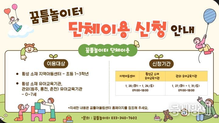 동네방네 김형규 기자 | 횡성군 꿈틀어울림센터 내 ‘꿈틀놀이터’가 아이들의 건강한 놀이 문화 확산을 위해 2026년도 상반기 단체 이용 신청을 받는다.