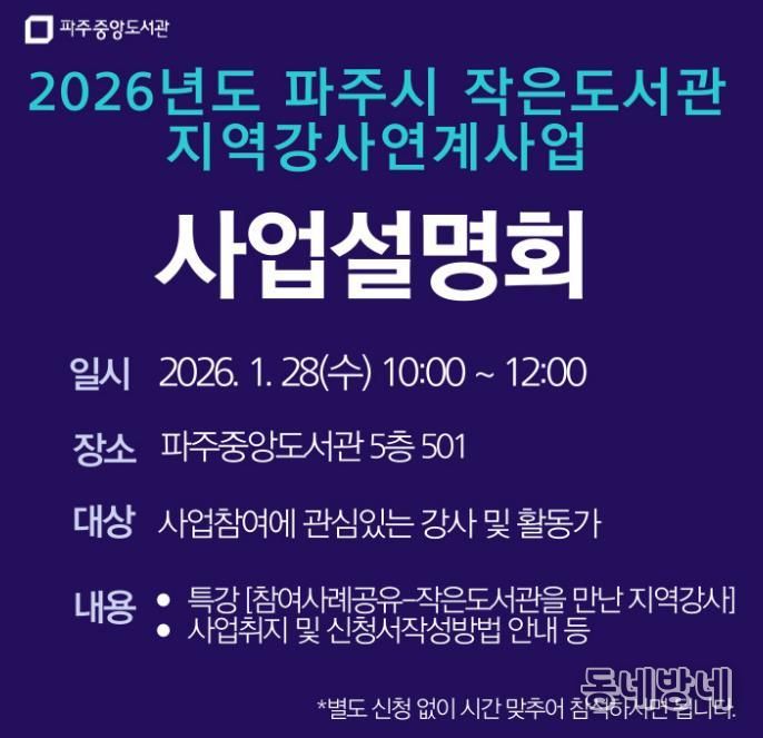 동네방네 김형규 기자 | 파주시 중앙도서관은 지역의 작가, 예술가, 독서문화 활동가 등 인재를 발굴해 작은도서관의 독서문화 프로그램을 지원하는 녪년 작은도서관 지역강사 연계사업’에 참여할 지역강사를 모집한다.